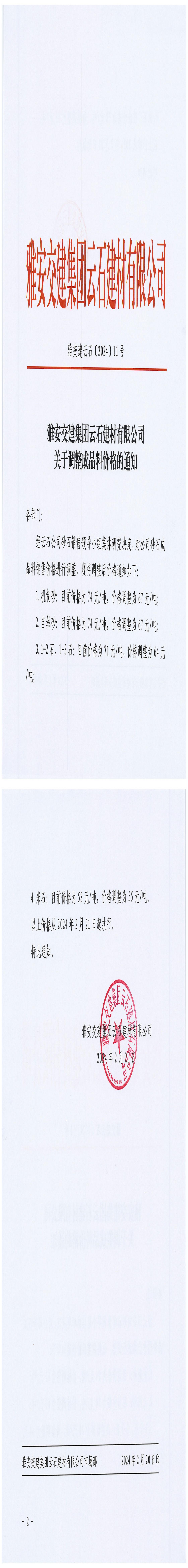 雅安交建集團云石建材有限公司成品料價格調(diào)整公告(2024-2-21)