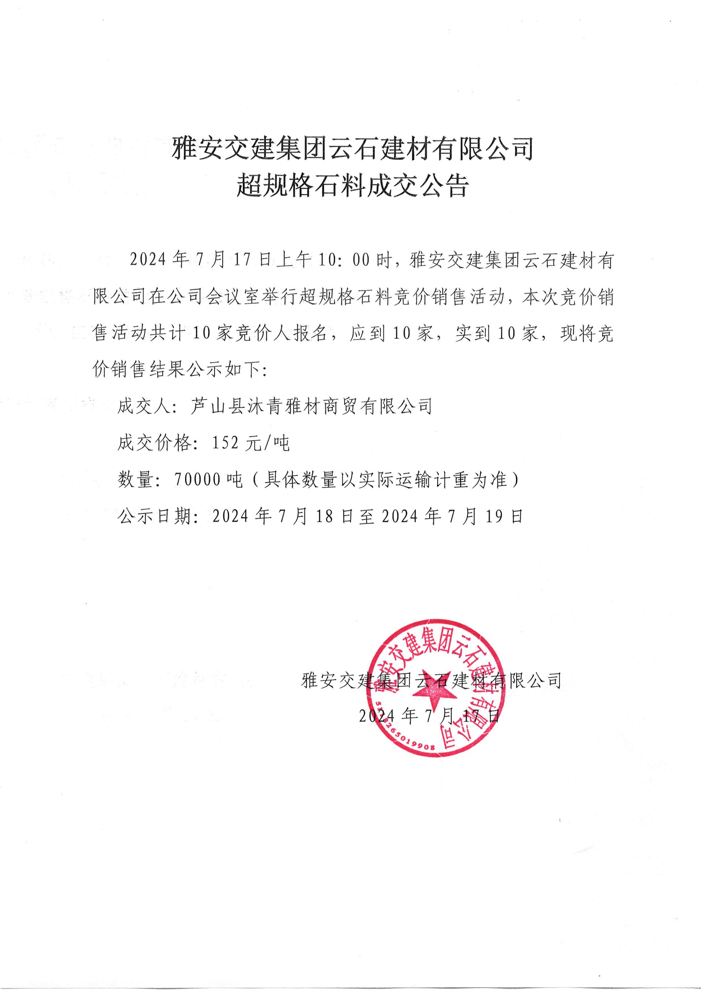 ÑŰ²½»½¨¼¯ˆFÔÆÊ¯½¨²ÄÓÐÏÞ¹«Ë¾ ³¬ÒŽ(gu¨©)¸ñʯÁϳɽ»¹«¸æ£¨2024.7.17£©