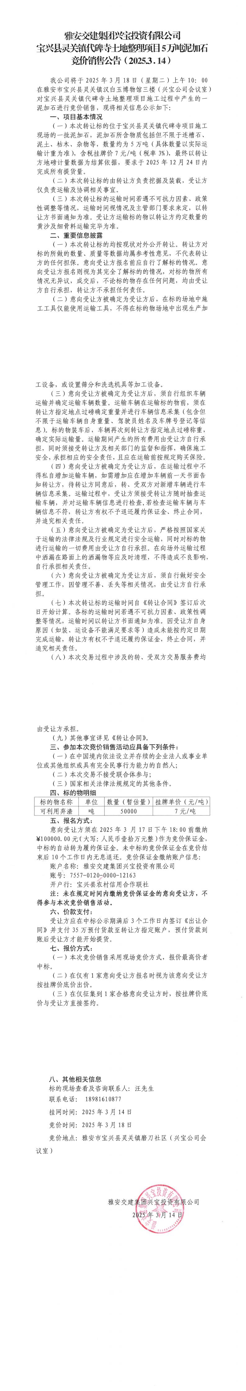 雅安交建集團(tuán)興寶投資有限公司寶興縣靈關(guān)鎮(zhèn)代碑寺土地整理項(xiàng)目5萬(wàn)噸泥加石競(jìng)價(jià)銷售公告(2025.03.14)