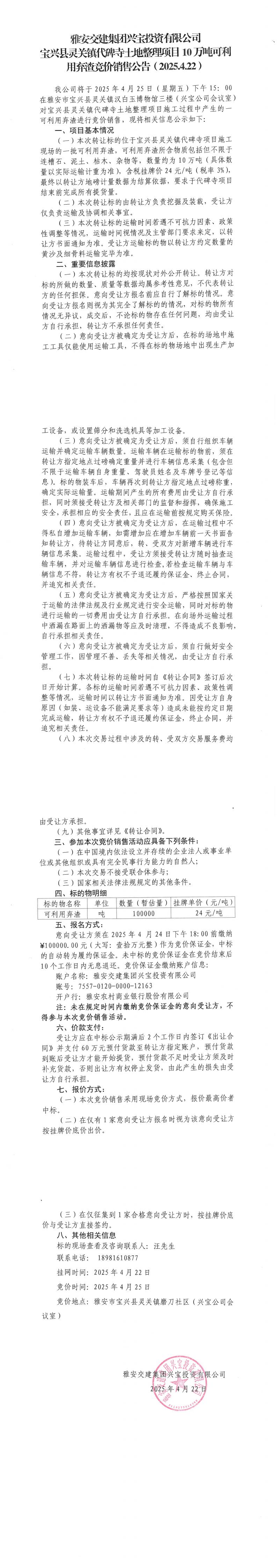 雅安交建集團(tuán)興寶投資有限公司寶興縣靈關(guān)鎮(zhèn)代碑寺土地整理項目10萬噸可利用棄渣競價銷售公告